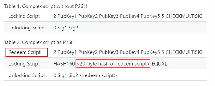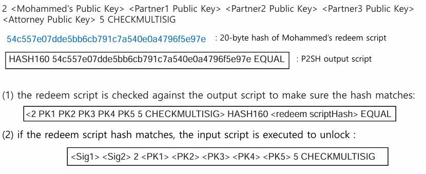 - 나중에 돈을 받는 사람이 돈을 쓸 때, 서명과 함께 원래의 긴 'Redeem Script'를 제출한다.