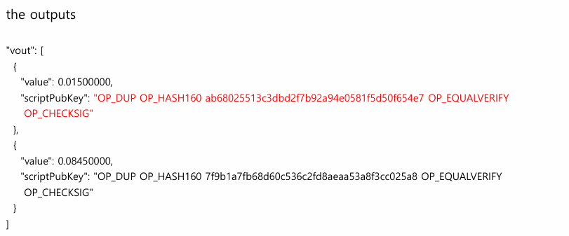 - scriptPubKey(누가 쓸 수 있는가) : 잠금 스크립트로, 이 스크립트를 풀 수 있는 개인키를 가진 사람만이 이 돈을 꺼내 쓸 수 있다.